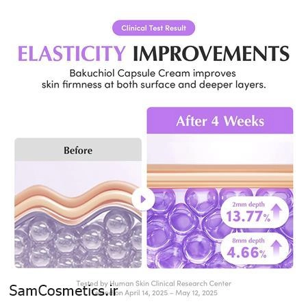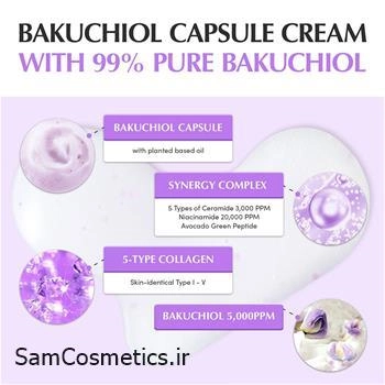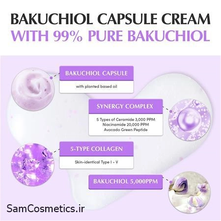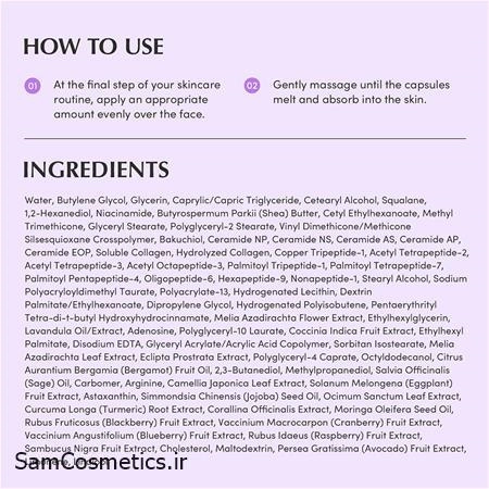 - کپسولهای بنفش حاوی غلظت بالای باکوچیول و آنتیاکسیدان که هنگام ماساژ باز شده و مواد مغذی را آزاد میکنند